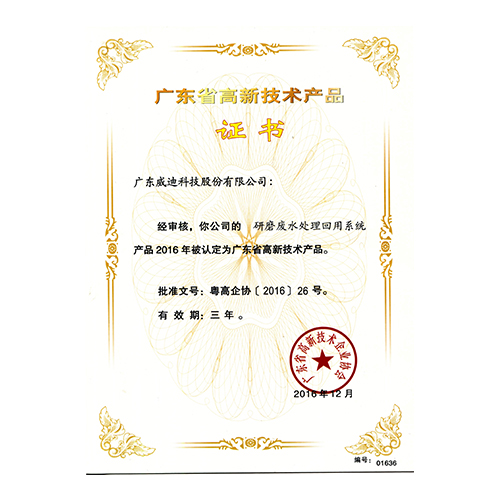 2016年廣東省高新技術產(chǎn)品-研磨廢水處理回用系統(tǒng)