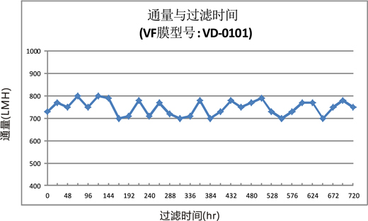 膜組件的過(guò)濾通量根據(jù)不同應(yīng)用領(lǐng)域及固體物含量多少而不同。過(guò)濾性能也要根據(jù)不同的流體而改變。下圖顯示了10支1米長(zhǎng)、單芯、孔徑為0.1微米的HDPE骨架PVDF過(guò)濾膜的膜組件,在處理投加了FeCl3 / NaOH的廢水其濁度大于500NTU的情況下的過(guò)濾通量。