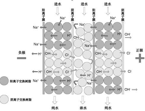 CDI 利用混和離子交換樹脂吸附水中的陰陽離子,同時這些被吸附的離子又在直流電壓的作用下,分別透過陰陽離子膜而被去除。