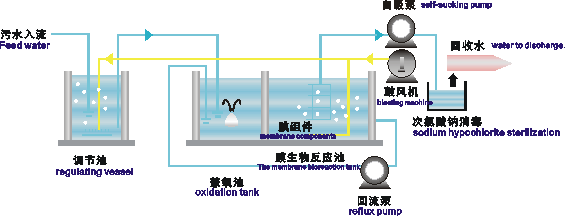 MBR技術(shù)是膜分離技術(shù)與生物技術(shù)有機結(jié)合的新型廢水處理技術(shù)。它利用膜分離組件將生化反應(yīng)池中的活性污泥和大分子有機物截留住,省掉二沉池。因此,活性污泥濃度可以大大提高,水力停留時間(HRT)和污泥停留時間(SRT)可以分別控制,而難降解的物質(zhì)在反應(yīng)器中不斷反應(yīng)和降解。因此,膜-生物反應(yīng)器工藝通過膜的分離技術(shù)大大強化了生物反應(yīng)器的功能。