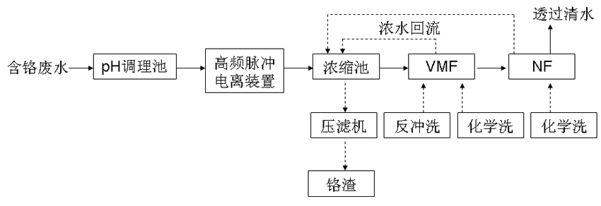 對(duì)于含鉻重金屬?gòu)U水,經(jīng)過(guò)調(diào)節(jié)pH后加入少量藥劑進(jìn)行破絡(luò)合,然后廢水進(jìn)入連續(xù)高頻脈沖電離系統(tǒng),經(jīng)過(guò)處理后的水調(diào)節(jié)pH直接進(jìn)入VMF,然后經(jīng)NF處理之后的產(chǎn)水中鉻含量可達(dá)到0.5mg/L以下,可達(dá)標(biāo)排放至污水處理中心進(jìn)一步生化處理或者直接進(jìn)RO系統(tǒng)進(jìn)行回用處理,以滿(mǎn)足企業(yè)60%回用的要求;污泥被壓渣后交具資質(zhì)的公司處理。系統(tǒng)中電離采用鐵陰極、炭纖維陽(yáng)極,電離反應(yīng)器中填充金屬泡沫,反應(yīng)時(shí)間30min;VMF帶自動(dòng)反沖洗系統(tǒng),每運(yùn)行約20-30分鐘自動(dòng)反沖洗15s左右,當(dāng)TMF膜的通量衰減到300L/m2h則自動(dòng)進(jìn)行化學(xué)清洗,根據(jù)運(yùn)行效果,大約每15天進(jìn)行化學(xué)清洗一次。當(dāng)NF污染到一定程度,則自動(dòng)進(jìn)行化學(xué)清洗,運(yùn)行中大約2-6月需化學(xué)清洗一次。