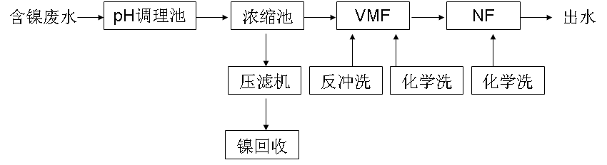 對(duì)于含酸鎳重金屬?gòu)U水,首先將廢水調(diào)節(jié)至pH 11~11.5,然后直接進(jìn)入VMF膜分離,以切向流過(guò)濾的形式其VMF濃水回流至濃縮池,而濃縮池內(nèi)水連接壓濾機(jī),將其中的鎳沉淀物直接壓成鎳渣進(jìn)行回收;而VMF透過(guò)液則進(jìn)入NF裝置,進(jìn)一步過(guò)濾其中的鎳離子,可達(dá)標(biāo)排放至污水處理中心進(jìn)一步生化處理;也可以直接回用普通的清洗或配套R(shí)O生產(chǎn)純水,以滿(mǎn)足企業(yè)60%回用的要求。鎳金屬可直接壓渣后加硫酸溶解后(硫酸鎳)回用或交具資質(zhì)的公司處理。TMF與NF組合工藝中TMF帶自動(dòng)反沖洗系統(tǒng),每運(yùn)行約20分鐘自動(dòng)反沖洗10s左右,當(dāng)TMF膜的能量衰減到300L/m2h則自動(dòng)進(jìn)行化學(xué)清洗,根據(jù)運(yùn)行效果,大約每15-20d進(jìn)行化學(xué)清洗一次。當(dāng)NF污染到一定程度,則自動(dòng)進(jìn)行化學(xué)清洗,運(yùn)行中大約2月需化學(xué)清洗一次。