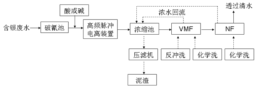 含銀廢水, 經(jīng)過(guò)調(diào)整pH后加入少量藥劑進(jìn)行破氰,再調(diào)節(jié)pH進(jìn)入連續(xù)高頻脈沖電離系統(tǒng),經(jīng)過(guò)處理后的水調(diào)節(jié)pH直接進(jìn)入TMF(固液分離膜系統(tǒng)),產(chǎn)水即可達(dá)標(biāo)排放至污水處理中心,也可以直接回用普通的清洗或配套R(shí)O生產(chǎn)純水,以滿(mǎn)足企業(yè)60%回用的要求。污泥被壓渣后交具資質(zhì)的公司處理。系統(tǒng)中電離采用鐵陰極、炭纖維陽(yáng)極,電離反應(yīng)器中填充金屬泡沫,反應(yīng)時(shí)間30min;VMF帶自動(dòng)反沖洗系統(tǒng),每運(yùn)行約20-30分鐘自動(dòng)反沖洗15s左右,當(dāng)TMF膜的通量衰減到300L/m2h則自動(dòng)進(jìn)行化學(xué)清洗,根據(jù)運(yùn)行效果,大約每15天進(jìn)行化學(xué)清洗一次。當(dāng)NF污染到一定程度,則自動(dòng)進(jìn)行化學(xué)清洗,運(yùn)行中大約2-6月需化學(xué)清洗一次。