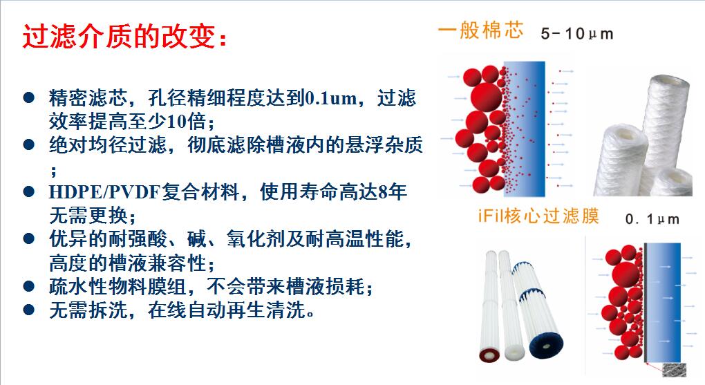 可直接去除鍍液中的有機分解物,不額外增加費用和時間,大大提高鍍液的使用時間,降低生產(chǎn)成本,槽液損耗極低,采用堅固燒結(jié)法成膜技術(shù),表面光滑,PVDF特殊材料制成,水分很難在材料中停留,進一步降低能耗。