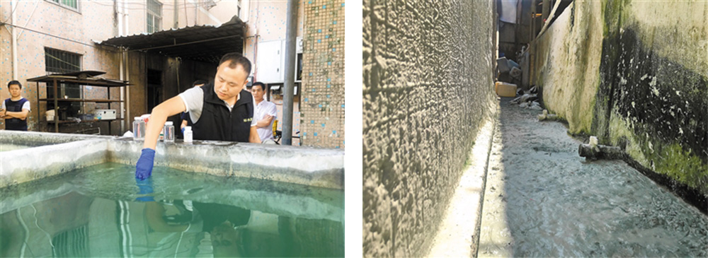 執(zhí)法人員當即采集了水樣、污泥樣本,現(xiàn)場對酸性除油池進行了PH試紙測試,發(fā)現(xiàn)部分水池PH值范圍在2~3,水質(zhì)呈酸性,其余水池污水的具體成分需要進一步檢測。執(zhí)法人員表示,若水質(zhì)檢測中發(fā)現(xiàn)存在重金屬、酸性超標等情況,將移交公安機關(guān)處理。