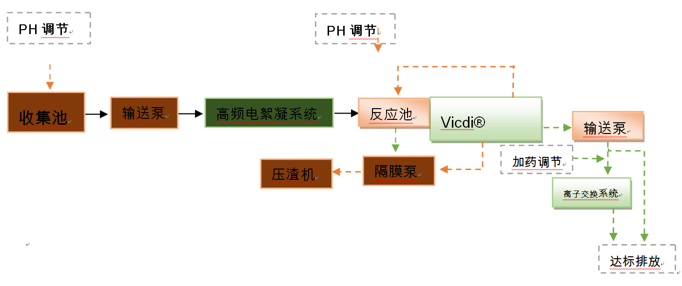 生產(chǎn)中產(chǎn)生的含鎳含鉻廢水收集至收費池,調(diào)節(jié) pH 值,進(jìn)入高頻脈沖電絮凝系統(tǒng),廢水被電離 分解后,再調(diào)節(jié) PH 值,進(jìn)入ⅴicdi MBR 固液分離系統(tǒng),污泥經(jīng)壓渣機(jī)固化后委外處理。產(chǎn)水調(diào)節(jié) pH 值,檢測水質(zhì)達(dá)標(biāo)即可直接排放。若水質(zhì)仍然超標(biāo),進(jìn)入離子交換系統(tǒng),確保水質(zhì)達(dá)標(biāo)排放。