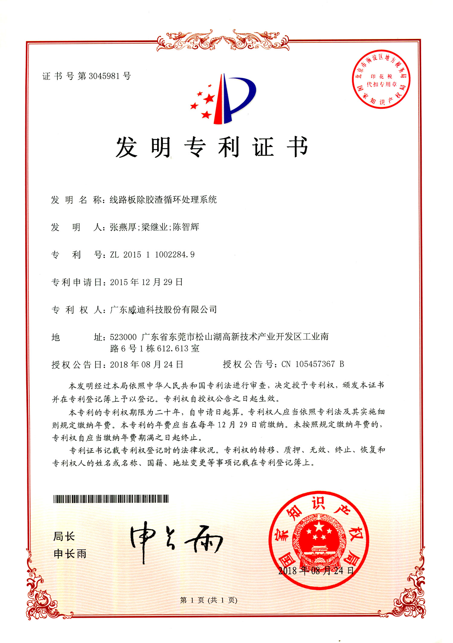20180824發(fā)明專利-線路板除膠渣循環(huán)處理系統(tǒng)