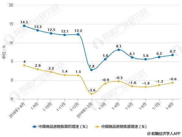 2018-2019年前8月中國商品房銷售面積、銷售額增速統(tǒng)計(jì)情況