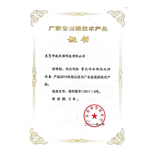2011年廣東省高新技術(shù)產(chǎn)品-管式污水微濾處理設(shè)備